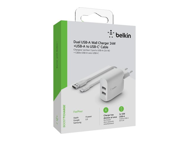 Belkin BoostCharge - Verkkosovitin - 24 watti(a) - 2 lähtöliittimet (USB) - valkoinen WCE001VF1MWH